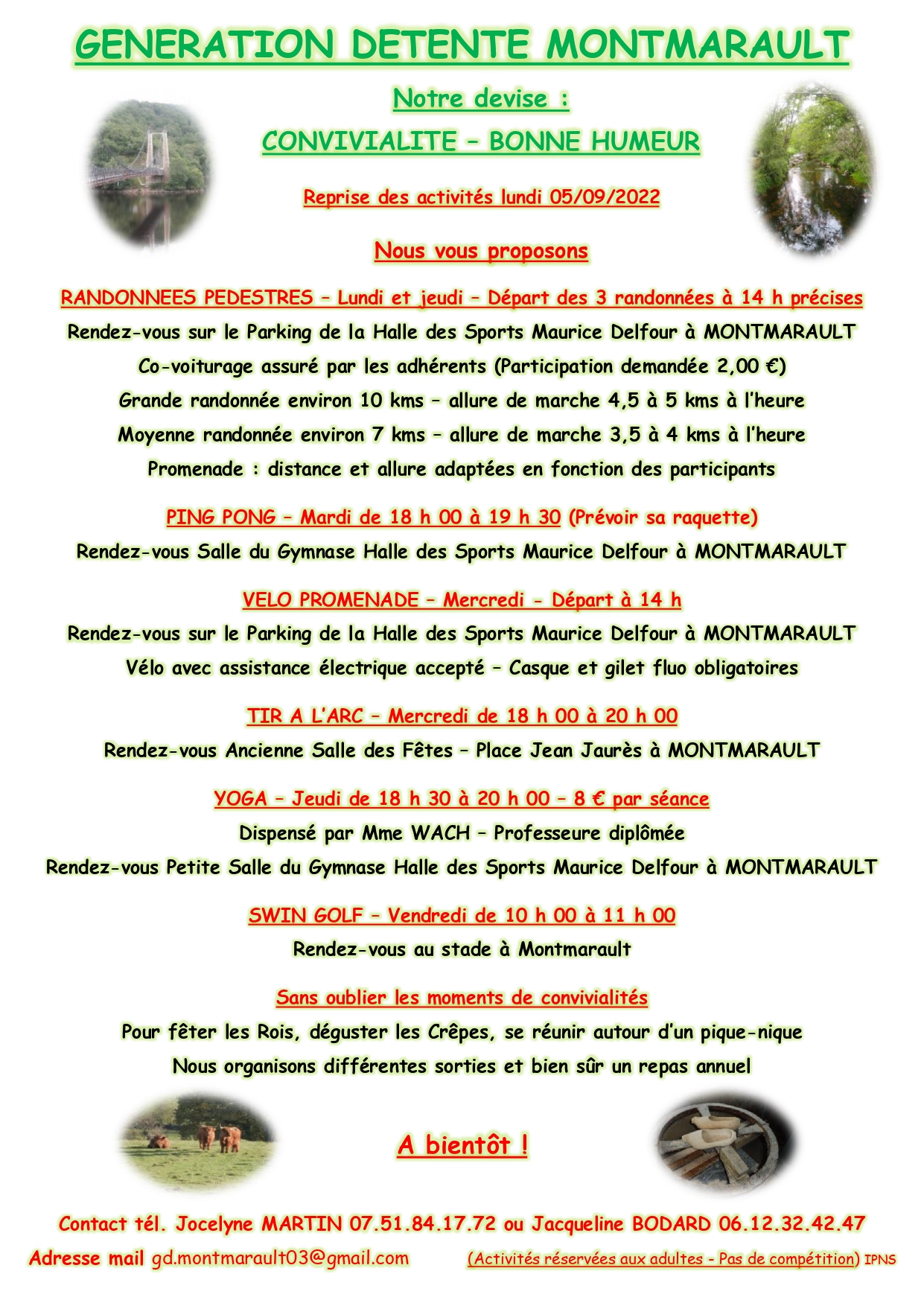 Randonnée Présidente : Jocelyne MARTIN Lire la suite de GDM GENERATION DETENTE MONTMARAULTOISE Centre rural de culture et de loisirs Président : M. LAFANECHERE Lire la suite de LA MINAGA Président : Michel Thomas Contact : Michel Flouret Lire la suite de RANDONNEE NERISIENNE Contact : Robert Blanchet Lire la suite de RANDO-VILLEFRANCHE