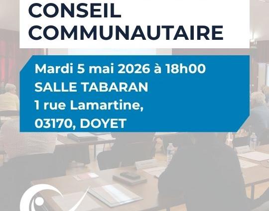 Read moreLe Conseil communautaire se réunira le mardi 5 mai 2026 à 18h00, à la Salle Tabaran, située 1 rue Lamartine – 03170 Doyet.
